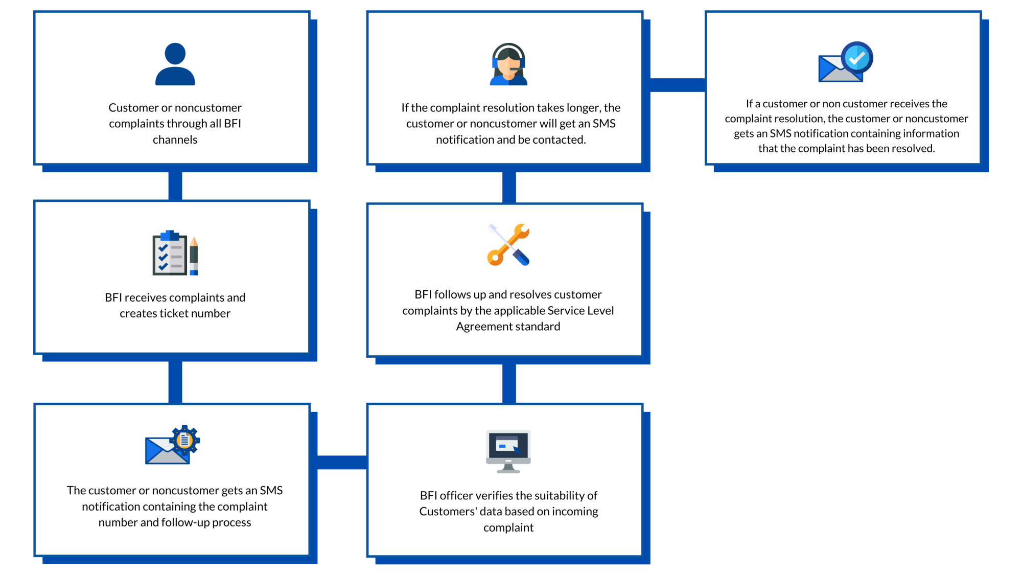 SLA for customer complaint is the entire time (in working days) needed by BFI Finance to resolve customer complaint from the moment a consumer files a complaint until the customer receives solution.